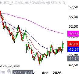 Det skulle krävas ett lyft mot 50,5 - 50,6 kronor för en långsiktig trendvändning, men detta scenario vågar vi inte räkna med just nu. Husqvarna kan pressas mot lägre kursnivåer idag.