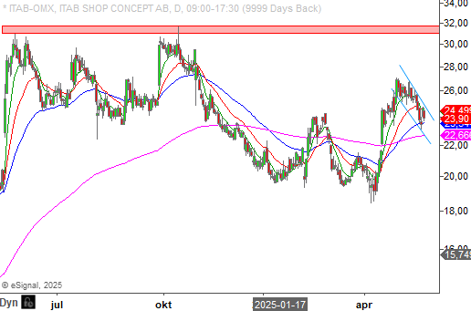 För att säljarna inte ska få chansen att ta ett för stort övertag i Itab, är det viktigt att den långa trendindikatorn vid 22,7 kronor inte passeras.