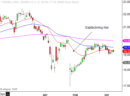 Rekylen i maj ledde till att gapet från april täcktes men sentimentet har försvagats de senaste veckorna då vi ser alltfler röda kursstaplar i aktien. Cirka 19 euro är härnäst ett viktigt stödområde.