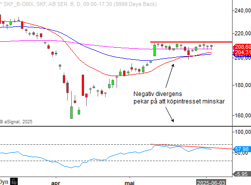 Vi noterar att en negativ divergens har bildats mellan momentumindikatorn och prisnoteringarna. Negativa divergenser uppstår när aktien bildar en högre topp men momentumindikatorn bildar en lägre topp. Detta är ofta en signal på en kortsiktig trendvändning.