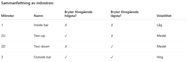 I denna del lärde du dig identifiera de tre grundmönstren som varje stapel på grafen antingen är eller blir. När du bemästrar att se 1:or, 2:or och 3:or kan du börja tolka vad marknaden försöker göra och inte bara vad den gjort.