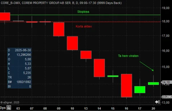 På motsvarande sätt kan man också med samma setup gå kort i aktier med bearish FTFC och 1-2D stapel. Exemplet ovan visar Corem Property Group och en säljsignal som föll på plats vid nedbrott från 1-2D. Här blev vinsten cirka 20 procent.